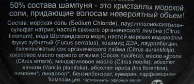 Если бы я не знала, что это шампунь, то однозначно сказала бы, что это скраб – настолько ощутимы кристаллы соли и настолько велико их количество в общей массе шампуня. Также помимо кристаллов в состав входят масла лимона, нероли, мандариновое и кокосовое масла и свежая морская вода (интересно, как это она может быть свежей?).